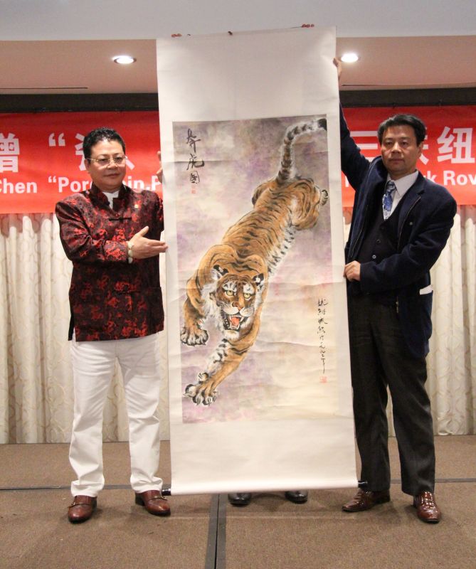 左为国际著名气功大师齐飞龙与全球艺术家联盟主席姚继在纽约法拉盛喜来登酒店楼画廊大厅拍卖会现场
